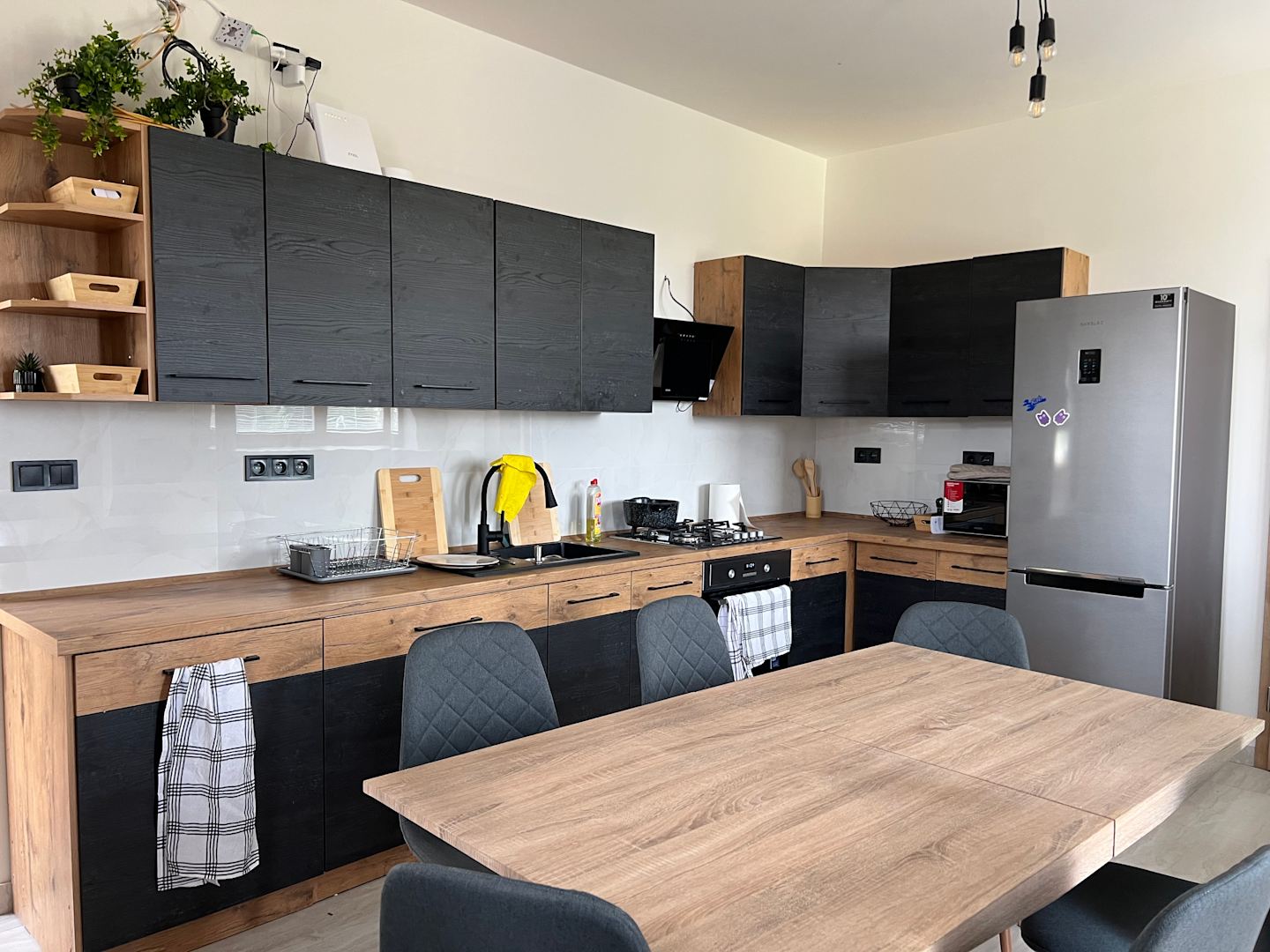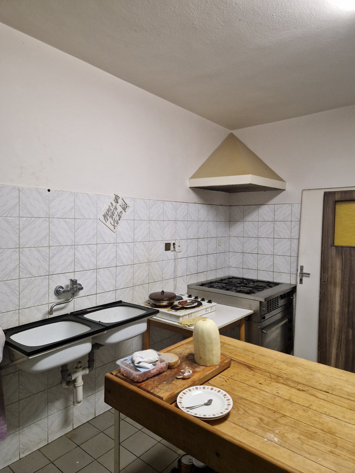 Pôvodná kuchyňa s dvojdrezom, plynovým sporákom a kachľovým obkladom (08/2024) → plne vybavená shared kitchen pre hostí.
